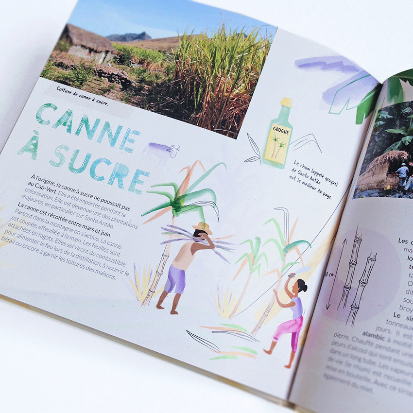 Illustration et conception graphique du livre Cap-Vert, éditions Grandir, 2019. Texte et photos Jacques Drouin. Album documentaire jeunesse collection Les Terres des hommes. 40 pages, format 22*22 cm, relié.