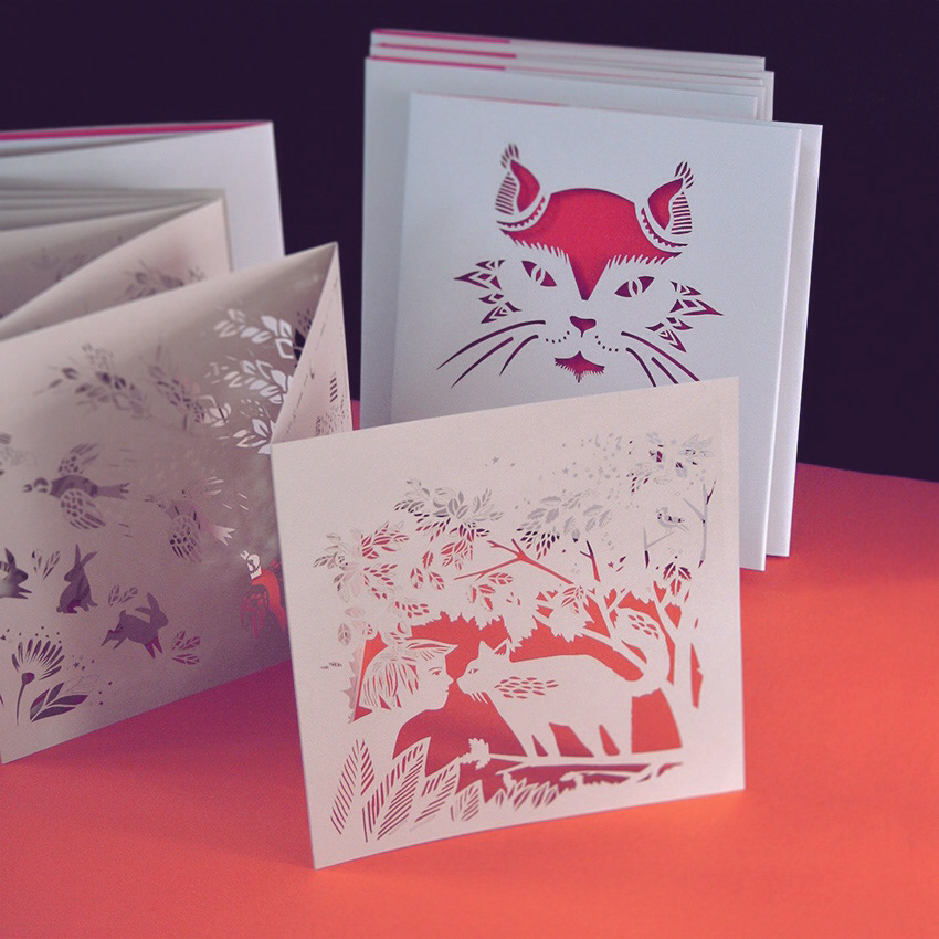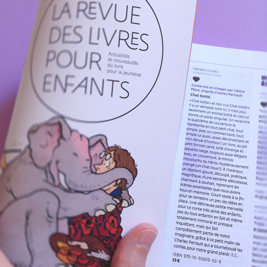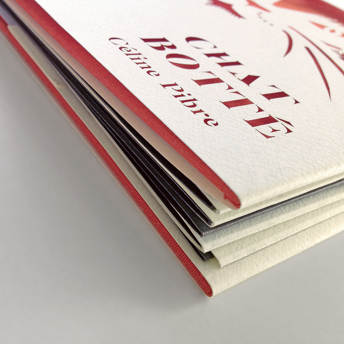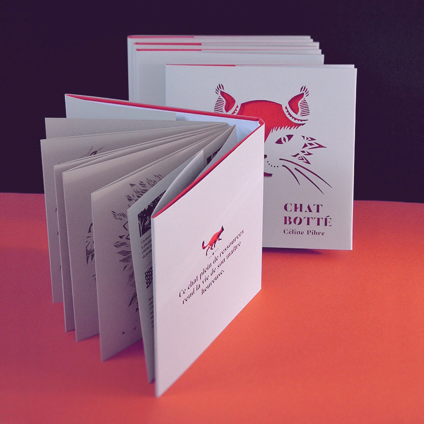 Livre-objet, illustrations en découpe sur papier d’art. Mise en image du conte Le Chat Botté de Charles Perrault. Différentes couleurs et textures de papiers Fedrigoni en fonction des tirages. — Leporello, façonné à la main, se déployant sur deux mètres. Couverture cartonnée et toilée avec une jaquette découpée. Format 21 x 21 cm. Fabriqué par Papiers Coupés à Nîmes. Parution novembre 2017. — « Coup de cœur » de La Revue des livres pour enfants, dossier Gilles Bachelet - Juin 2018, n° 301 publié par le Centre national de la littérature pour la jeunesse (BnF).