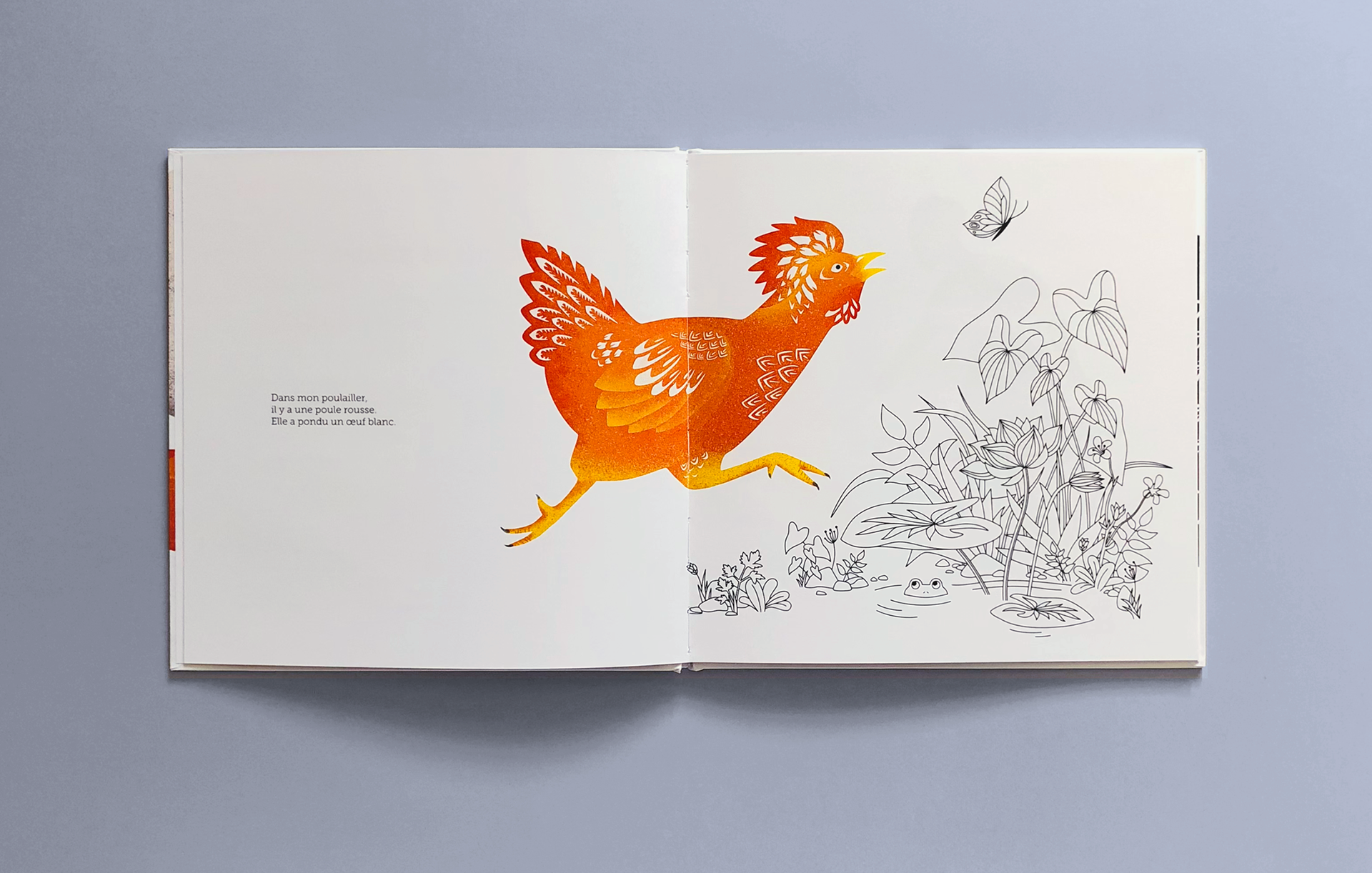 La traversée d'un jardin... Une poule rousse, une poule noire et une poule blanche pondent chacune un œuf. Trois œufs de trois couleurs différentes. Et quand les poussins briseront leur coquille ? Une histoire de Ginou Jussel Éditeur Lirabelle 32 pages, quadrichromie, format 22*22 cm Couverture cartonnée. Septembre 2022 Existe en Kamishibaï (français - anglais) 13 planches, quadrichromie, format 28*38 cm